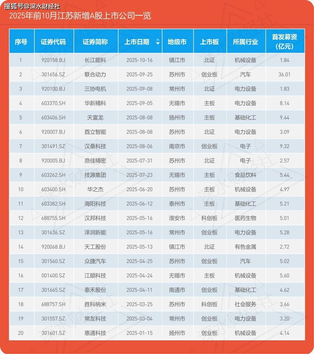 今天发布的是2025年10月江苏A股上市公司IPO榜,后续将持续更新10月江苏资本市场发展报告内容,敬请关注。 《江苏资本市场发展报告系列》是由江苏金融圈与深水财经社联合出品,已经连续发布十年,已成为江苏区域资本市场的权威研究成果和知名内容品牌。 根据Wind数据,10月,A股新上9家公司,和往月的情况差不多。 | 陸号 | 证券代码 | 证券简称 | 上市日期 ( ) | 地级市 | 上市板 | 所属行业 | 首发募资 (亿元) | | --- | --- | --- | --- | --- | --- | --- | --- | | 1 | 920158.BJ | 长江能材 | 2025-10-16 | 镇江市 | 北证 | 机械设备 | 1.84 | | 2 | 301656.5Z | 联合动力 | 2025-09-25 | 苏州市 | 创业板 | 汽车 | 36.01 | | 3 | 920100.BJ | 三协电机 | 2025-09-08 | 常州市 | 北证 | 电力设备 | 1.83 | | 4 | 603370.5H | 华新精科 | 2025-09-05 | 元锡市 | 主板 | 电力设备 ...