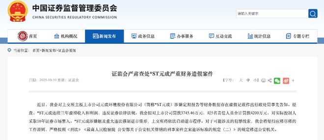 记者丨崔文静 编辑丨姜诗蔷 视频丨许婷婷 又一例上市公司财务造假案迎来监管重拳。 2025年10月10日,证监会正式对*ST元成(元成环境股份有限公司)作出行政处罚事先告知,揭开这家 公司连续三年系统性财务造假的黑幕。 根据调查结果,*ST元成在2020年至2022年期间,累计虚增营业收入高达2.09亿元,虚增利润总额5046 万元。更严重的是,公司在2022年非公开发行股票文件中,直接引用了这些虚假财务数据,构成欺诈发 行。 为此,*ST元成及其主要责任人员收到了巨额罚单:上市公司主体被处以3745.46万元罚款;5名责任人 员合计被罚4200万元,其中实际控制人、董事长祝昌个人独揽2800万元罚款,并被采取10年证券市场禁 入措施。 证监会同时明确表示,对可能涉及的犯罪线索将移送公安机关处理。 此案还标志着*ST元成成为2025年以来第13家触及重大违法强制退市指标的上市公司。上交所对其依法 启动退市程序。 业内专家指出,近期重大违法退市案例增多,并非因为造假公司数量增加,而是源于退市新规的重大调 整。新规不仅明确了"连续三年及以上造假即坚决出清"的要求,还适度下调了"造假金额+造假比例"的 退市门槛,使 ...