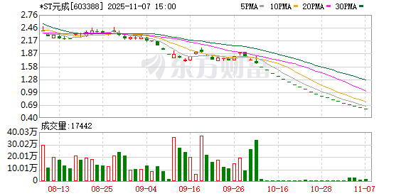 *ST元成(603388)或仅剩下最后一个交易日。 11月8日,*ST元成(603388)发布了两则提示退市风险的公告。公告显示,公司触及多项退市风险。 | 公告日期 | 标题 | | --- | --- | | 2025-11-08 | "2 *ST元成:关于公司股票可能存在因市值低于5亿元而终止上市的第十一次风险暨第二次股价低于1元的... | | 2025-11-08 | ₪ *ST元成:可能被实施重大违法强制退市的第五次风险提示公告 | 其中,截至11月7日收盘,公司总市值为1.99亿元,已连续19个交易日总市值低于5亿元,即使后续1个交易日(不包含公司股票全天停牌日)涨停,也将因连续20个 交易日收盘总市值低于5亿元而触及交易类强制退市。此外,公司股票2025年11月7日收盘价为0.61元,已连续10个交易日低于1元。即使后续10个交易日(不包含公 司股票全天停牌日)连续涨停,也将因连续20个交易日收盘总市值低于5亿元而触及交易类强制退市。 根据相关规定,交易类强制退市公司股票不进入退市整理期。上市公司股票及其衍生品种在触及该类指标的次一交易日起开始停牌,交易所将在停牌之日起5个交 易日内,向公司发 ...