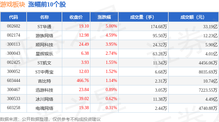 证券之星消息,10月22日游戏板块较上一交易日上涨1.19%,ST华通领涨。当日上证指数报收于3913.76,下跌0.07%。深证成指报收于12996.61, 下跌0.62%。游戏板块个股涨跌见下表: | 代码 | 名称 | 收盘价 | 涨跌幅 | 成交量(手) | 成交额(元) | | | --- | --- | --- | --- | --- | --- | --- | | 002602 | ST华通 | 19.10 | 5.00% | 174.68万 | | 33.19亿 | | 002174 | 游族网络 | 12.98 | 4.59% | 95.50万 | | 12.23亿 | | 300113 | 顺网科技 | 24.49 | 3.95% | 24.32万 | | 5.90/Z | | 300043 | 星辉娱乐 | 6.38 | 2.74% | 63.28万 | | 4.01亿 | | 002425 | ST凯文 | 3.93 | 1.55% | 11.34万 | | 4456.06万 | | 300052 | ST中青宝 | 12.03 | 1.52% | 6.68万 | | 8035.69万 ...