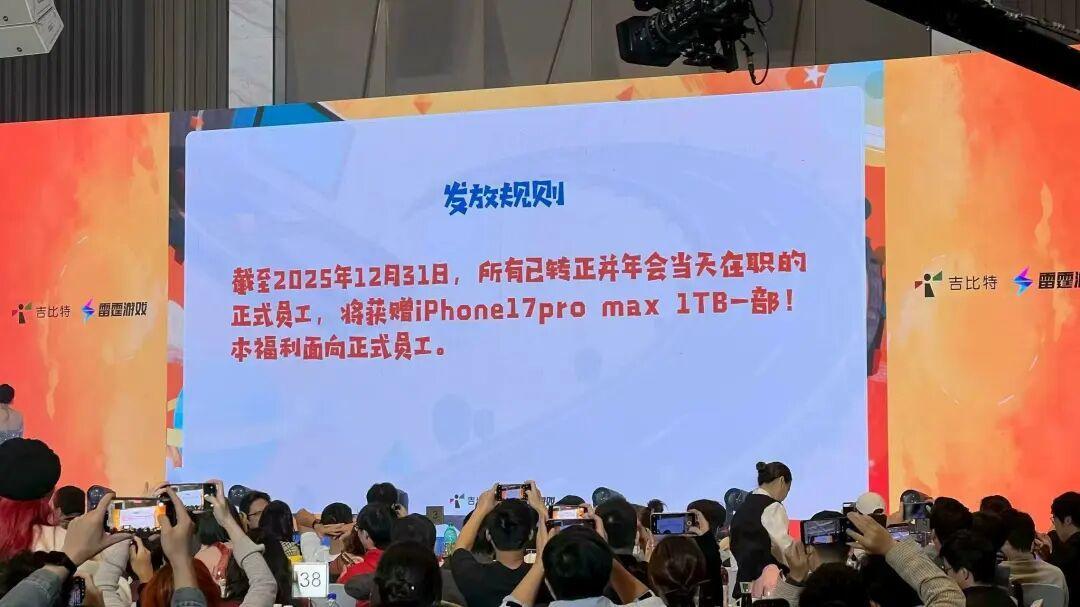 又到了一年一度的年会季。在朋友圈看到别人家年会礼品,你的心情是不是也很复杂?南都N视频记者近期从各种渠道了解到游戏公司年会奖品依然丰 厚,其中黄金类奖品已成了年会新宠。 发放规则 截至2025年12月31日,所有已转正并年会当天在职的 = 吉比特 + 雷霆| ri 吉出特 ←雷霆湖观 正式员工, 将获赠iPhone17pro max 1TB-音B! 本福利面向正式员工。 根据吉比特公司1月底发布的业绩预告,2025年全年归母净利润预计达到16.9亿至18.6亿元,同比增长79%至97%,其中《杖剑传说》是这轮业绩反弹的最 大推手。而多方消息显示,本次吉比特年会上《杖剑传说》制作人林笋直接拿到了一套价值千万的房产,项目组成员则每人收获20克定制金币。吉比特送 房其实有迹可循。2022年年会上,当时的爆款游戏《一念逍遥》主策划就曾获赠深圳华侨城一套豪宅。 该消息经过各家游戏自媒体传播,受到各界广泛关注。对此,互联网产业分析师张书乐指出,资金充裕的游戏公司向来不吝于重奖功臣。老牌游戏企业吉 比特虽近年未推出重度游戏爆款,仍延续买量拓市策略,但凭借几款轻量级游戏实现稳健盈利。作为行业标杆,其重奖核心团队、普惠员工的举 ...