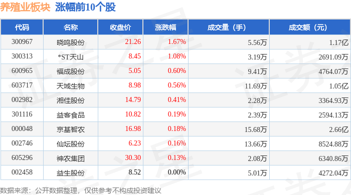 | 代码 | 名称 | 收盘价 | 涨跌幅 | 成交量(手) | 成交额(元) | | --- | --- | --- | --- | --- | --- | | 300967 | 膀鸣股份 | 21.26 | 1.67% | 5.56万 | 1.17亿 | | 300313 | *ST天山 | 8.45 | 1.08% | 3.19万 | 2691.09万 | | 600965 | 福成股份 | 5.05 | 0.60% | 9.41万 | 4764.07万 | | 603717 | 天域生物 | 8.98 | 0.56% | 1 11.69万 | 1.05亿 | | 002982 | 湘佳股份 | 14.79 | 0.41% | 2.28万 | 3364.93万 | | 301116 | 益客食品 | 10.82 | 0.19% | 2.39万 | 2594.13万 | | 000048 | 京基督农 | 16.98 | 0.18% | 15.68万 | 2.66亿 | | 002746 | 仙坛股份 | 6.23 | 0.16% | 13.66万 | 8524.88万 | | 605296 | 神农集团 ...