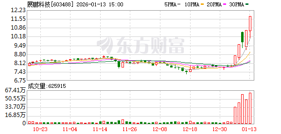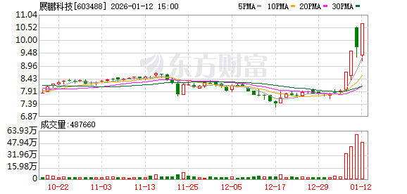 展鹏科技再度涨停,5个交易日内录得4个涨停,累计涨幅为48.42%,累计换手率为82.66%。截至 14:32,该股今日成交量5633.57万股,成交金额6.19亿元,换手率19.29%。最新A股总市值达34.28亿 元。 龙虎榜数据显示,该股因连续三个交易日内,涨幅偏离值累计达20%、日振幅值达15%上榜龙虎榜2 次,买卖居前营业部中,机构净卖出906.35万元,营业部席位合计净买入757.68万元。 据天眼查APP显示,展鹏科技股份有限公司成立于2001年02月08日,注册资本29199.044万人民币。 (数据宝) 近日该股表现 | 日期 | 当日涨跌幅(%) | 换手率(%) | 主力资金净流入(万元) | | --- | --- | --- | --- | | 2026.01.12 | 10.00 | 16.70 | 14422.40 | | 2026.01.09 | 1.36 | 20.33 | -4451.17 | | 2026.01.08 | 10.00 | 14.73 | 11625.61 | | 2026.01.07 | 9.99 | 11.61 | 4972.88 | | 2026.01 ...