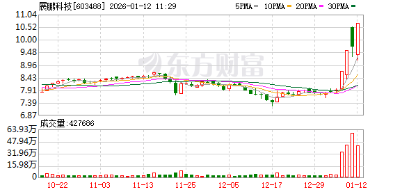 近日该股表现 展鹏科技再度涨停,4个交易日内录得3个涨停,累计涨幅为34.89%,累计换手率为59.49%。截至 10:42,该股今日成交量3743.74万股,成交金额3.67亿元,换手率12.82%。最新A股总市值达31.16亿 元。 龙虎榜数据显示,该股因连续三个交易日内,涨幅偏离值累计达20%、日振幅值达15%上榜龙虎榜1 次,买卖居前营业部中,机构净卖出3340.16万元,营业部席位合计净买入7572.90万元。 据天眼查APP显示,展鹏科技股份有限公司成立于2001年02月08日,注册资本29199.044万人民币。 (数据宝) | 日期 | 当日涨跌幅(%) | 换手率(%) | 主力资金净流入(万元) | | --- | --- | --- | --- | | 2026.01.09 | 1.36 | 20.33 | -4451.17 | | 2026.01.08 | 10.00 | 14.73 | 11625.61 | | 2026.01.07 | 9.99 | 11.61 | 4972.88 | | 2026.01.06 | 1.15 | 1.51 | 139.97 | | 2026.01.0 ...