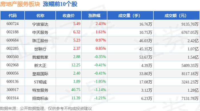 证券之星消息,11月4日房地产服务板块较上一交易日下跌0.09%,南都物业领跌。当日上证指数报收于 3960.19,下跌0.41%。深证成指报收于13175.22,下跌1.71%。房地产服务板块个股涨跌见下表: 从资金流向上来看,当日房地产服务板块主力资金净流出273.3万元,游资资金净流入552.18万元,散户 资金净流出278.88万元。房地产服务板块个股资金流向见下表: | 代码 | 名称 | 主力净流入(元) | 主力净占比 游资净流入 (元) | | 游资净占比 散户净流入(元) | | 散户净占比 | | --- | --- | --- | --- | --- | --- | --- | --- | | 600684 珠江股份 | | 1895.12万 | 7.84% | -279.57万 | -1.16% | -1615.55万 | -6.68% | | 001914 招商积余 | | 900.91万 | 12.63% | -94.52万 | -1.33% | -806.39万 | -11.31% | | 600724 宁波富达 | | 894.07万 | 9.79% | -166.67万 | ...
