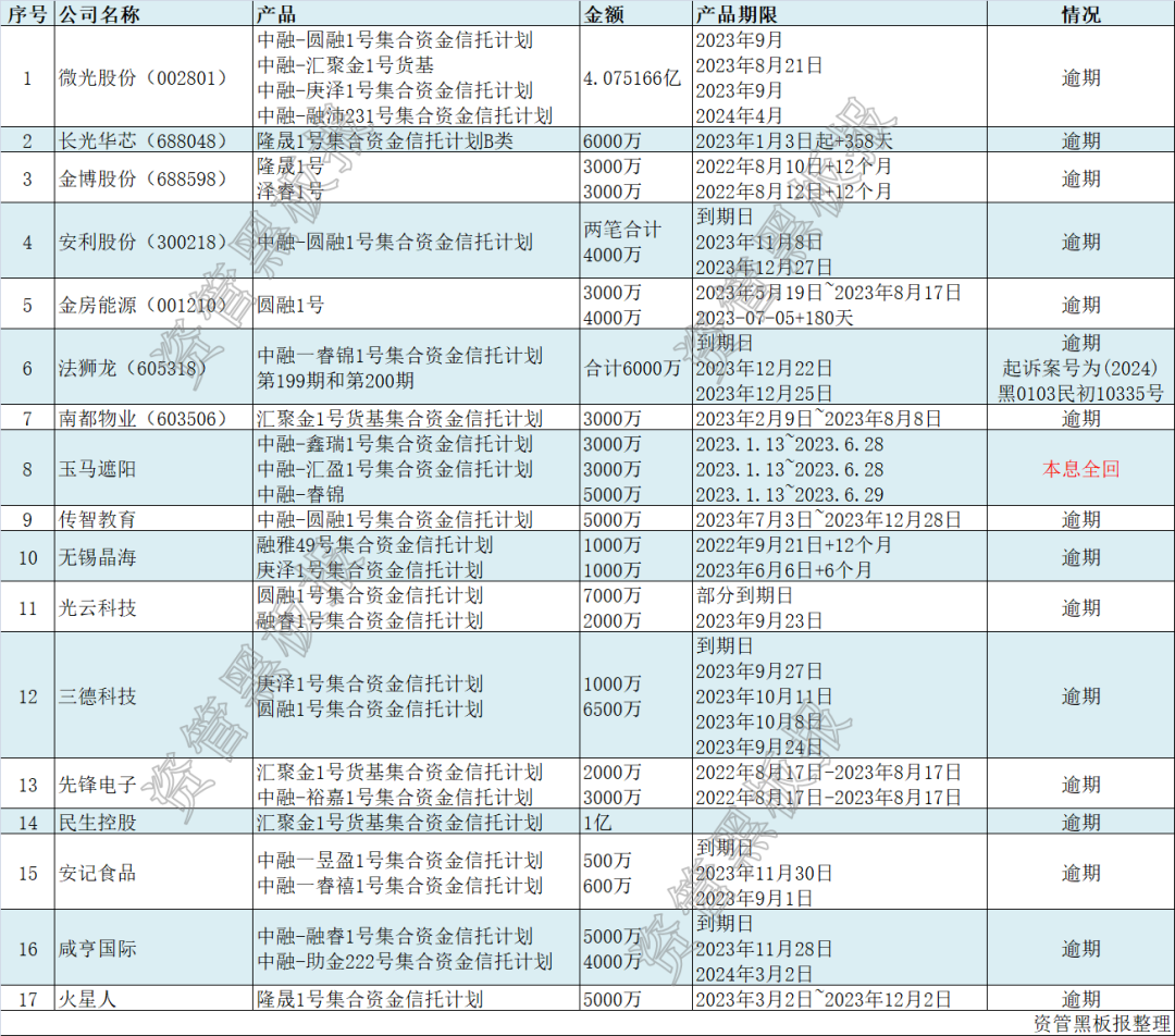 摘要:哪些公司踩雷中融信托理财产品? 踩雷中融信托理财产品公开机构投资者(上市公司为主)有哪些?以下为交易所公告披露的购买中融信托理财产品的机构,以A股上市公司为主,均来自 公司公告与权威媒体报道。 据资管黑板报不完全统计,至少有16家公司踩雷了中融信托理财产品。见下表。 | 序号 公司名称 | | 产品 | 金额 | 产品期限 | 情况 | | --- | --- | --- | --- | --- | --- | | 1 | 微光股份(002801) | 中融-圆融1号集合资金信托计划 | | 2023年9月 | | | | | 中融-汇聚金1号货基 | 4.075166亿 | 2023年8月21日 | 逾期 | | | | 中融-庚泽1号集合资金信托计划 | | 2023年9月 | | | | | 中融-融簿231号集合资金信托计划 | | 2024年4月 | | | 2 | 长光华芯(688048) | 隆晟1号集合资金信托计划B类 | 6000万 | 2023年1月3日起+358天 | 逾期 | | 3 | 金博股份(688598) | 隆霞1号 > | 3000万 | 2022年8月10日~12个 ...