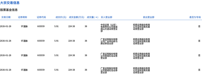 1月28日,ST通脉大宗交易成交152万股,成交额898.32万元,占当日总成交额的13.92%,成交价5.91 元,较市场收盘价6.52元折价9.36%。 | 交易日期 | 证券简称 | 证券代码 | | | 成交价(元) 成交金额(万元) 成交量(*) 买入营业部 | | 类出管业部 | 是否为专场 | | --- | --- | --- | --- | --- | --- | --- | --- | --- | | 2026-01-28 | ST通験 | 603559 | 5.91 | 224.58 | 38 | 有限量公司管理 | 品 - 2000 - 1000 - 1000 - 1000 - 1000 - 1000 - 1000 - 1000 - 1000 | 图 | | 2026-01-28 | ST通販 | 603559 | 5.91 | 224.58 | 38 | ្រីការការក៏មាន | | Ka | | 2026-01-28 | ST通販 | 603559 | 5.91 | 224.58 | 38 | 各类管理局营造 | 品有限公司出货器 | 部 | | 2026-01- ...