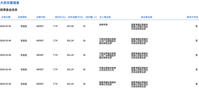 | 交易日期 | 证券商称 | 证券代码 | | | 成交价(元) 成交金额(万元) 成交量(*) 买入营业部 | | 类出管业部 | 是否为专场 | | --- | --- | --- | --- | --- | --- | --- | --- | --- | | 2026-02-04 | 珍宝鸟 | 603567 | 7.74 | 247.68 | 32 | 机构专用 | 有限公司 2017 | 품 | | 2026-02-04 | 珍宝忍 | 603567 | 7.74 | 201.24 | 26 | 交易L 利用品名录 | DE SERVER | Ka | | 2026-02-04 | 珍宝岛 | 603567 | 7.74 | 201.24 | 26 | 名制 - 刘尚武容家 | 有限公司 发展 | 중 | | 2026-02-04 | 珍宝鸟 | 603567 | 7.74 | 201.24 | 26 | 公司北京分公司限 | 有限公司 2017 | 播 | | 2026-02-04 | 珍宝忍 | 603567 | 7.74 | 201.24 | 26 | | BRAND SER | Ka | ...