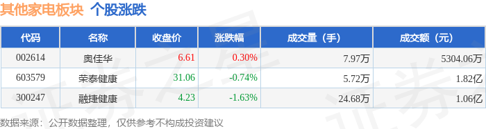 证券之星消息,10月13日其他家电板块较上一交易日下跌2.55%,荣泰健康领跌。当日上证指数报收于 3889.5,下跌0.19%。深证成指报收于13231.47,下跌0.93%。其他家电板块个股涨跌见下表: | 代码 | 名称 | 收盘价 | 涨跌幅 | 成交量(手) | 成交额(元) | | | --- | --- | --- | --- | --- | --- | --- | | 300247 | 融捷健康 | 4.30 | 3.86% | 36.71万 | | 1.54亿 | | 002614 | 奥佳华 | 6.59 | -1.05% | 9.42万 | | 6154.90万 | | 603579 | 荣泰健康 | 31.29 | -6.35% | 7.49万 | | 2.36亿 | 从资金流向上来看,当日其他家电板块主力资金净流出5340.58万元,游资资金净流入1453.56万元,散户 资金净流入3887.02万元。其他家电板块个股资金流向见下表: | 代码 | | | 名称 主力净流入(元) 主力净占比 游资净流入(元) 游资净占比 散户净流)(元) 散户净占比 | | | | | --- | ...