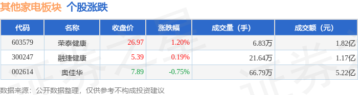 证券之星消息,1月22日其他家电板块较上一交易日上涨0.35%,荣泰健康领涨。当日上证指数报收于 4122.58,上涨0.14%。深证成指报收于14327.05,上涨0.5%。其他家电板块个股涨跌见下表: | 代码 | 名称 | 收盘价 | 涨跌幅 成交量(手) | 成交额(元) | | | --- | --- | --- | --- | --- | --- | | 603579 | 荣泰健康 | 26.97 | 1.20% | 6.83万 | 1.82亿 | | 300247 | 融捷健康 | 5.39 | 0.19% | 21.64万 | 1.17亿 | | 002614 | 奥佳化 | 7.89 | -0.75% | 66.79万 | 5.22亿 | 以上内容为证券之星据公开信息整理,由AI算法生成(网信算备310104345710301240019号),不构成投资建议。 从资金流向上来看,当日其他家电板块主力资金净流出1484.5万元,游资资金净流入2162.82万元,散户 资金净流出678.32万元。其他家电板块个股资金流向见下表: | 代码 | | | 名称 主力净流入(元) 主力净占比 游资净流 ...