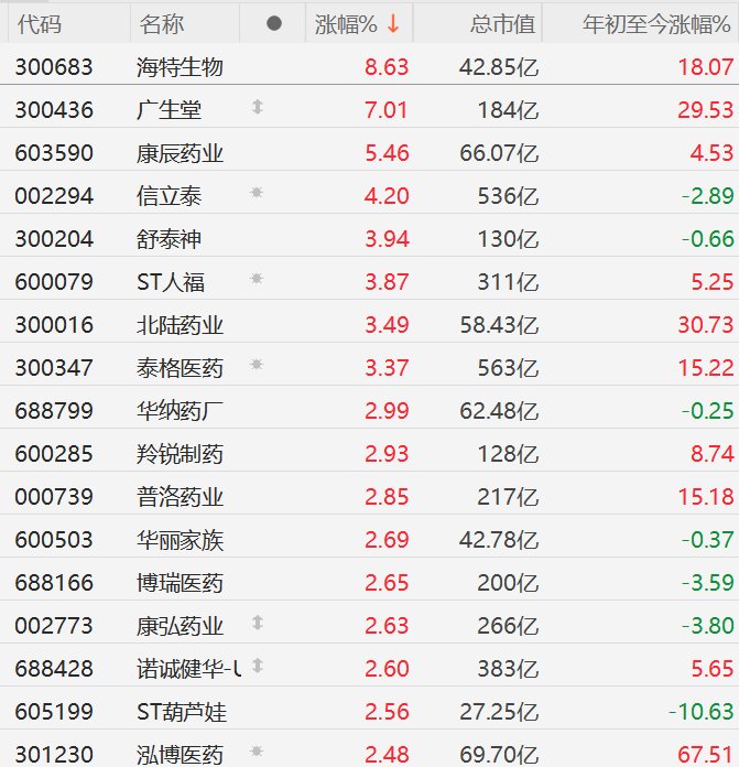 | 代码 | 名称 | | 涨幅% ↓ | 总市值 | 年初至今涨幅% | | --- | --- | --- | --- | --- | --- | | 300683 | 海特生物 | | 8.63 | 42.85亿 | 18.07 | | 300436 | 广生堂 | 4 | 7.01 | 184亿 | 29.53 | | 603590 | 康辰约业 | | 5.46 | 66.07亿 | 4.53 | | 002294 | 信立泰 | 章 | 4.20 | 536亿 | -2.89 | | 300204 | 舒泰神 | | 3.94 | 130亿 | -0.66 | | 600079 | ST人福 | 事 | 3.87 | 311亿 | 5.25 | | 300016 | 北陆经业 | | 3.49 | 58.43亿 | 30.73 | | 300347 | 泰格医药 | 资 | 3.37 | 563亿 | 15.22 | | 688799 | 华纳药厂 | | 2.99 | 62.48 Z | -0.25 | | 600285 | 羚锐制药 | | 2.93 | 128亿 | 8.74 | | 000 ...