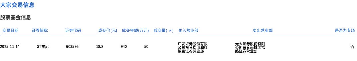 | 交易日期 | 证券简称 | 证券代码 | 成交价(元) 成交金额(万元) 成交量( * ) 买入营业部 | | 卖出营业部 | | --- | --- | --- | --- | --- | --- | | 2025-11-14 | ST东尼 | ୧୦3595 | 18.8 940 50 | 厂发证券股份有限 | 类古渠筹货运 | 11月14日,ST东尼大宗交易成交50万股,成交额940万元,占当日总成交额的5.79%,成交价18.8元,较市场收盘价18.57元溢价1.24%。 ...