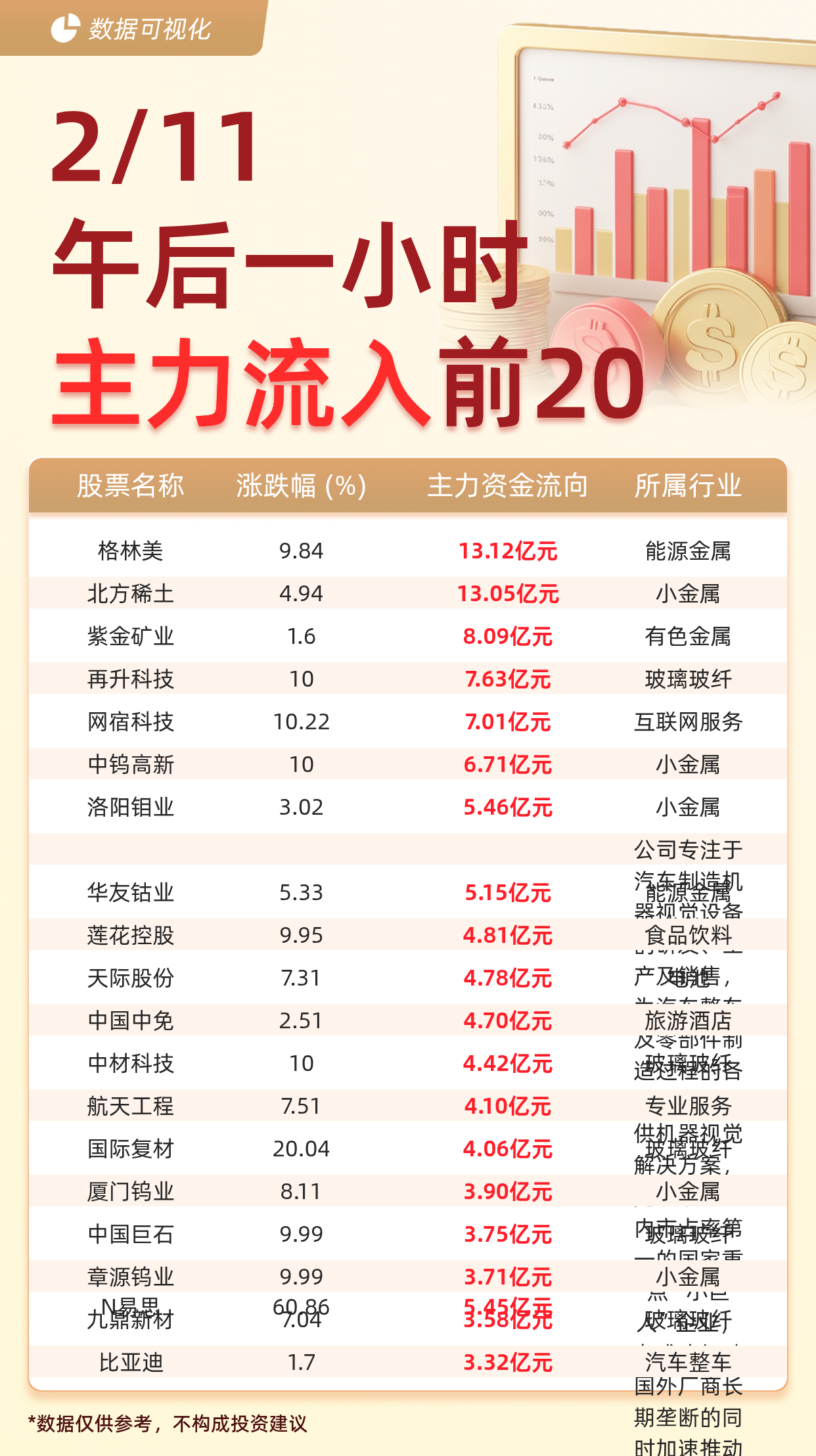 | 股票名称 | 涨跌幅 (%) | 主力资金流向 | 所属行 | | --- | --- | --- | --- | | 格林美 | 9.84 | 13.12亿元 | 能源金属 | | 北方稀土 | 4.94 | 13.05亿元 | 小金属 | | 紫美矿业 | 1.6 | 8.09亿元 | 有色金属 | | 再升科技 | 10 | 7.63亿元 | 玻璃玻丝 | | 网宿科技 | 10.22 | 7.01亿元 | 互联网服 | | 中钨高新 | 10 | 6.71亿元 | 小金属 | | 洛阳钼业 | 3.02 | 5.46亿元 | 小金属 | | | | | 公司专注 | | 华友钻业 | 5.33 | 5.15亿元 | THERMAN | | 莲花控股 | ਰੇ 'ਰੇਦ | 4.81亿元 | | | 天际股份 | 7.31 | 4.78亿元 | 严人培训培 | 据交易所数据显示,截至2月11日午后一小时,主力资金流入前20的股票分别为: 格林美(13.12亿元)、 北方稀土(13.05亿元)、 紫金矿业(8.09亿 元)、 再升科技(7.63亿元)、 网宿科技(7.01亿元)、 中钨高新(6.71亿 ...