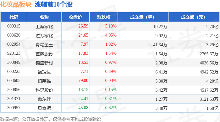 证券之星消息,10月14日化妆品板块较上一交易日上涨0.31%,上海家化领涨。当日上证指数报收于 3865.23,下跌0.62%。深证成指报收于12895.11,下跌2.54%。化妆品板块个股涨跌见下表: | 代码 | 名称 | 收盘价 | 涨跌幅 | 成交量(手) | 成交额(元) | | | --- | --- | --- | --- | --- | --- | --- | | 600315 | 上海家化 | 26.59 | 5.10% | 10.27万 | | 2.70亿 | | 603630 | 拉芳家化 | 24.65 | 4.05% | 9.02万 | | 2.21亿 | | 002094 | 青岛金王 | 7.97 | 1.92% | 41.34万 | | 3.29亿 | | 920123 | 芭薇股份 | 17.83 | 1.54% | 1.54万 | | 2765.67万 | | 300849 | 锦盛新材 | 13.53 | 0.97% | 2.98万 | | 4036.56万 | | 600223 | 福瑞达 | 7.71 | 0.39% | 6.41万 | | 4942.52万 | | ...