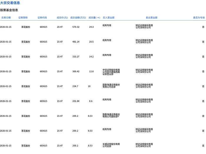 | 交易日期 | 证券简称 | 证券代码 | | | 成交价(元) 成交金额(万元) 成交量(*) 买入营业部 | | 类出营业部 | 是否为专场 | | --- | --- | --- | --- | --- | --- | --- | --- | --- | | 2026-01-15 | 茶花般份 | 603615 | 23.47 | 570.32 | 24.3 | 机构专用 | ** | 香 | | 2026-01-15 | 茶花服份 | 603615 | 23.47 | 481.14 | 20.5 | 机构专用 | 製高品器製品製 | る | | 2026-01-15 | 茶花般份 | 603615 | 23.47 | 333.27 | 14.2 | 机构专用 | 製高量器器控制限 | る | | 2026-01-15 | 资花股份 | 603615 | 23.47 | 300.42 | 12.8 | 중 2000 명품품 | 製音量翻譯控意思 | KII | | 2026-01-15 | 茶花般份 | 603615 | 23.47 | 234.7 | 10 | 有限公司及器械的 | 製高量器房飲育園 ...