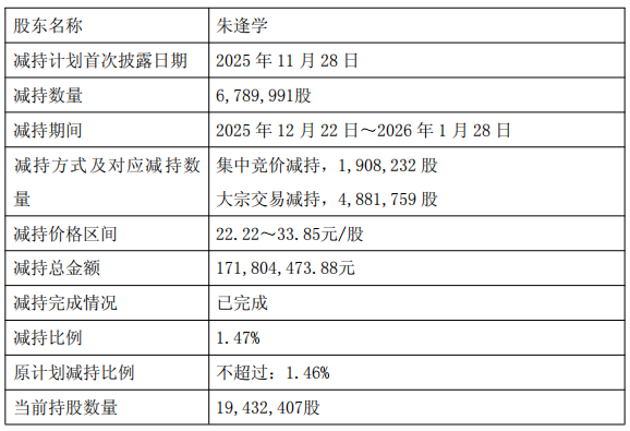| 股东名称 | 上海共荣投资中心(有限合伙) | | --- | --- | | 减持计划首次披露日期 | 2025年11月28日 | | 减持数量 | 4,146,811股 | | 减持期间 | 2025年12月19日~2026年1月14日 | | 减持方式及对应减持数 | 集中竞价减持,1,852,400 股 | | 물 | 大宗交易减持,2,294,411 股 | | 减持价格区间 | 21.98~23.29元/股 | | 减持息金额 | 94,228,251.08元 | | 减持完成情况 | 已完成 | | 减持比例 | 0. 90% | | 原计划减持比例 | 不超过:0.90% | | 当前持股数量 | 0股 | | 当前持股比例 | 0% | | 股东名称 | 上海共远投资中心(有限合伙) | | --- | --- | | 减持计划首次披露日期 | 2025年11月28日 | | 减持数量 | 2.991,130股 | | 减持期间 | 2025年12月26日~2026年1月14日 | | 减持方式及对应减持数 | 集中竞价减持,921,300 股 | | 를 | 大宗交易减持,2,069, ...