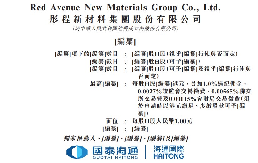[編纂]項下的[編纂]數目 : [編纂]股H股(視乎[編纂]行使與否而定) |编纂|數目 : [编纂]股H股(可予[编纂]) |编纂|數目 : [編纂]股H股(可予[編纂]及視乎[編纂]行使與 合向定) 最高[編纂] : 每股H股[編纂]港元,另加1.0%經紀佣金、 0.0027%證監會交易徵費、0.00565%聯交 所交易費及0.00015%會財局交易徵費(須 於申請時以港元繳足,多繳股款可予J編 纂I) 面值 : 每股H股人民幣1.00元 【编纂】: [编纂] l 繼續] 獨家保薦人、[編纂]、[編纂]及[編纂] 据港交所2月8日披露,彤程新材料集团股份有限公司(简称:彤程新材(603650.SH))向港交所主板递交上市申请书,国 泰海通/海通国际为独家保荐人。招股书显示,彤程新材是中国领先的综合性新材料服务供应商,专注于先进化工产 品。公司主要从事新型化工材料的研发、生产、营销、销售及分销。于往绩记录期间,公司的主要业务包括三个分 部,即(i)电子材料;(ii)轮胎用橡胶助剂及其他化工产品;及(iii)可完全生物降解材料。 Red Avenue New Materials Group Co., Ltd. ...