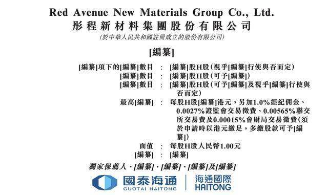 | 编纂 項下的 编纂]數目 | : [编纂]股H股(視乎 编纂]行使與否而定) | | --- | --- | | 编纂 數目 : | 【编纂】股H股(可予编纂]) | | 编纂 敷目 : . | 编纂 股H股(可予 编纂]及視乎 编纂 行使與 | | 否而定) | | | 最高 编纂 : 每股H股[編纂]港元,另加1.0%經紀佣金、 | | | 0.0027%證監會交易徵費、0.00565%聯交 | | | 所交易費及0.00015%會財局交易徵費(須 | | | 於申請時以港元繳足,多繳股款可予[编 | | | 资I) | | | 面值 : 每股H股人民幣1.00元 | | | [编纂] : 编纂] | | | 獨家保薦人、[編纂]、[編纂]及 編纂] | | | 海通國際 國泰海通 | | | HATTONG JUOTAl HAITONG | | 2026年2月8日,来自上海的A股上市公司彤程新材料集团股份有限公司 Red Avenue New Materials Group Co., Ltd.(以下简称"彤程新材")在港交所递交招股 书,拟香港主板IPO上市。 彤程新材(603650.SH),于20 ...