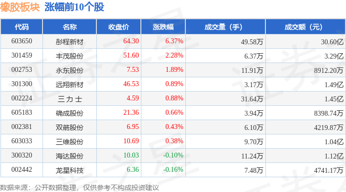 | 代码 | 名称 | 收盘价 | 涨跌幅 | 成交量(手) | 成交额(元) | | --- | --- | --- | --- | --- | --- | | 603650 | 彤程新材 | 59.96 | 10.00% | 39.43万 | 22.48 Z | | 920225 | 利通科技 | 36.81 | 3.81% | 5.47万 | 2.03亿 | | 300121 | 阳谷华泰 | 13.47 | 2.82% | 22.13万 | 2.95 亿 | | 605183 | 确成股份 | 20.40 | 2.77% | 2.88万 | 5849.54万 | | 300731 | 科创新源 | 52.30 | 1.26% | 7.04万 | 3.67亿 | | 002753 | 永东股份 | 7.35 | 1.10% | 9.03万 | 6597.58万 | | 001207 | 联科技 | 24.68 | 1.06% | 3.20万 | 7882.21万 | | 300767 | 震安科技 | 21.10 | 0.76% | 12.56万 | 2.70亿 | | 002224 | 三力士 | 4 ...