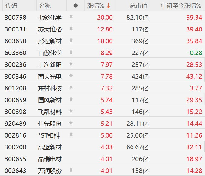 | 代码 | 名称 | | 涨幅% ↓ | 总市值 | 年初至今涨幅% | | --- | --- | --- | --- | --- | --- | | 300758 | 七彩化学 | 1 | 20.00 | 82.10亿 | 59.34 | | 300331 | 苏大维格 | 1 | 12.80 | 117亿 | 39.40 | | 603650 | 彤程新材 | 1 | 10.00 | 369亿 | 35.84 | | 603360 | 百傲化学 | 1 | 8.29 | 227亿 | -0.28 | | 300236 | 上海新阳 | 学 | 7.97 | 257亿 | 28.53 | | 300346 | 南大光电 | * | 7.78 | 424亿 | 43.12 | | 601208 | 东材科技 | 泰 | 7.32 | 285亿 | 3.77 | | 000820 | 国风新材 | 求 | 5.74 | 117亿 | 29.35 | | 300398 | 飞凯材料 | 来 | 5.43 | 146亿 | 15.22 | | 920489 | 佳先股份 | 兼 | 5.21 | 28.11亿 ...