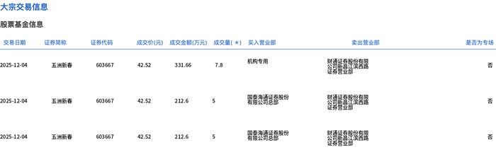 12月4日,五洲新春大宗交易成交17.8万股,成交额756.86万元,占当日总成交额的0.41%,成交价42.52 元,较市场收盘价45.9元折价7.36%。 | 交易日期 | 证券简称 | 证券代码 | | | 成交价(元) 成交金额(万元) 成交量(*) 买入营业部 | | 卖出营业部 | 是否为专场 | | --- | --- | --- | --- | --- | --- | --- | --- | --- | | 2025-12-04 | 五洲新春 | 603667 | 42.52 | 331.66 | 7.8 | 机构专用 | 2013 2018 11:32 | Ka | | 2025-12-04 | 五洲新春 | 603667 | 42.52 | 212.6 | ટે | 用意表高度發驗的 | 品有限公司送料器 | KI | | 2025-12-04 | 五洲新春 | 603667 | 42.52 | 212.6 | ਵੇ | 用意表會是登錄的 | 型高品質盤具备 | Ka | ...