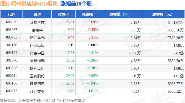 从资金流向上来看,当日医疗耗材供应链SPD板块主力资金净流出2.31亿元,游资资金净流出1183.68万 元,散户资金净流入2.43亿元。医疗耗材供应链SPD板块个股资金流向见下表: 证券之星消息,1月30日医疗耗材供应链SPD板块较上一交易日下跌1.65%,塞力医疗领跌。当日上证指 数报收于4117.95,下跌0.96%。深证成指报收于14205.89,下跌0.66%。医疗耗材供应链SPD板块个股涨 跌见下表: | 代码 | 名称 | 收盘价 | 涨跌幅 | 成交量(手) | 成交额(元) | | --- | --- | --- | --- | --- | --- | | 688329 | 文隆科技 | 25.01 | 3.69% | 2.18万 | 5401.67万 | | 603987 | 康德莱 | 9.26 | 0.43% | 5.85万 | 5399.36万 | | 000705 | 浙江震元 | 9.44 | 0.11% | 8.34万 | 7863.30万 | | 301126 | 达嘉维康 | 12.19 | 0.00% | 8.95万 | 1.08亿 | | 603122 | 合富中国 | ...