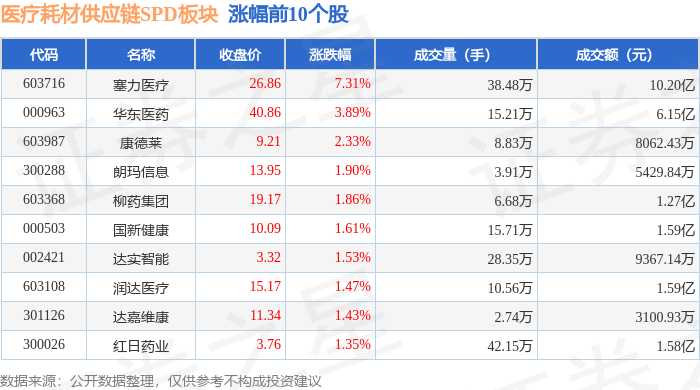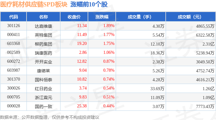 证券之星消息,10月10日医疗耗材供应链SPD板块较上一交易日下跌0.4%,塞力医疗领跌。当日上证指 数报收于3897.03,下跌0.94%。深证成指报收于13355.42,下跌2.7%。医疗耗材供应链SPD板块个股涨跌 见下表: | 代码 | 名称 | 收盘价 | 涨跌幅 | 成交量(手) | 成交额(元) | | --- | --- | --- | --- | --- | --- | | 301126 | 达嘉维康 | 11.34 | 1.89% | 4.30万 | 4865.55万 | | 000411 | 英特集团 | 11.49 | 1.77% | 5.54万 | 6322.58万 | | 603368 | 柳药集团 | 19.20 | 1.75% | 12.10万 | 2.31亿 | | 002589 | 瑞康医药 | 2.86 | 1.06% | 18.36万 | 5238.94万 | | 600272 | 开开实业 | 12.82 | 0.87% | 2.38万 | 3049.50万 | | 603987 | 康德莱 | 9.04 | 0.78% | 5.26万 | 4752.74万 | | ...