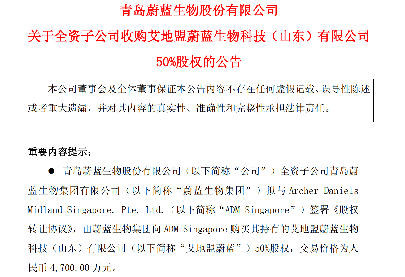 鲁股观察 | 从合作终止到全资控股:蔚蓝生物4700万元“接盘”合资公司