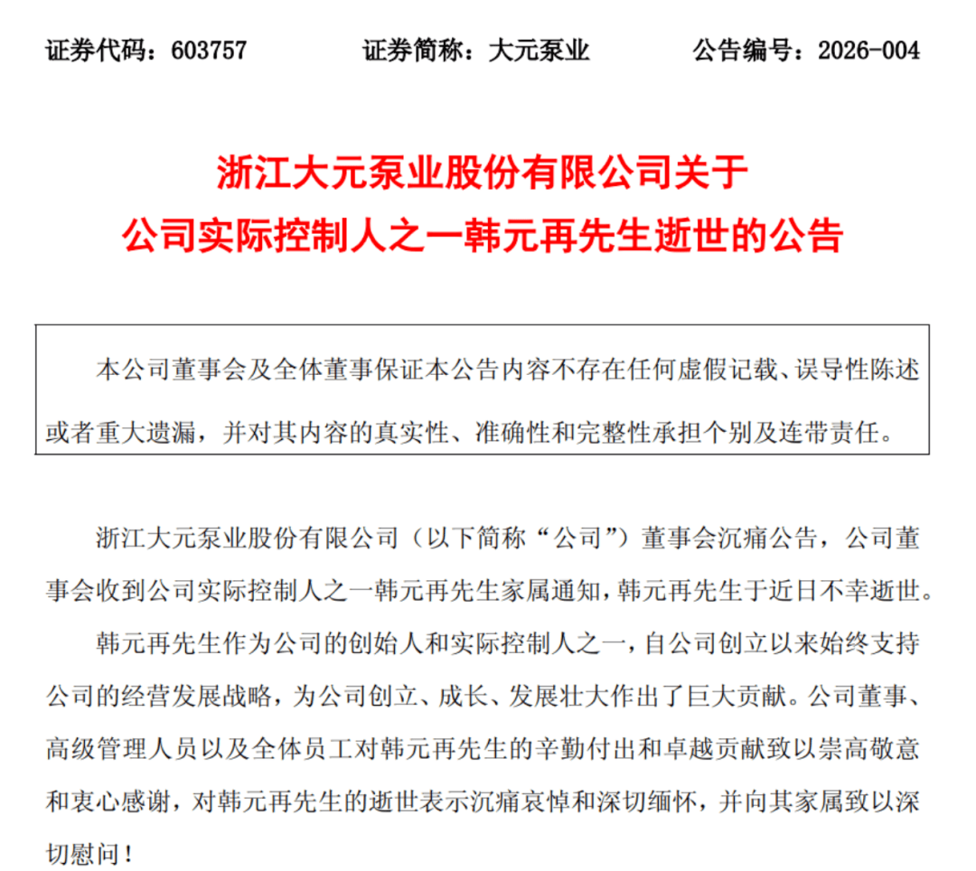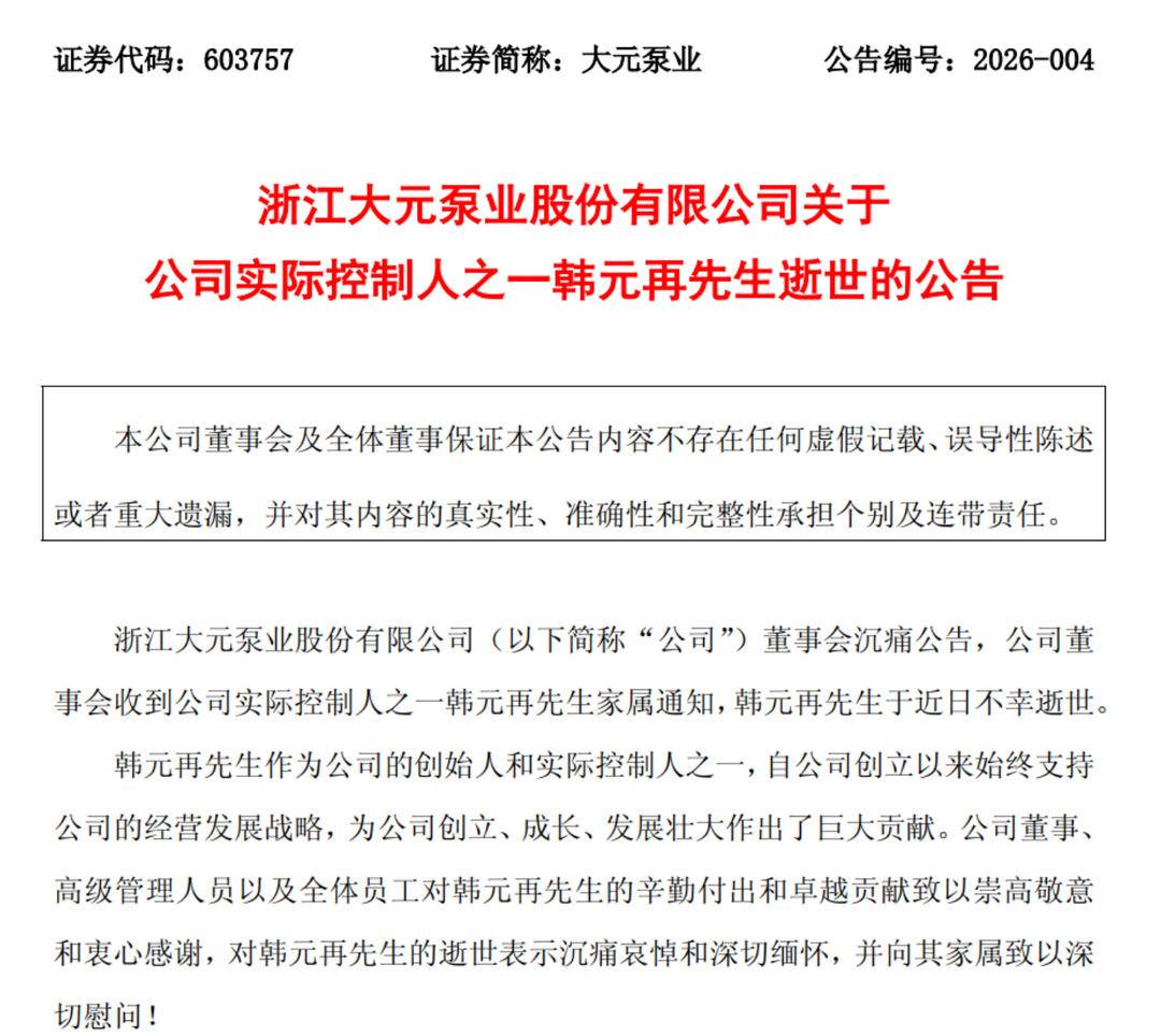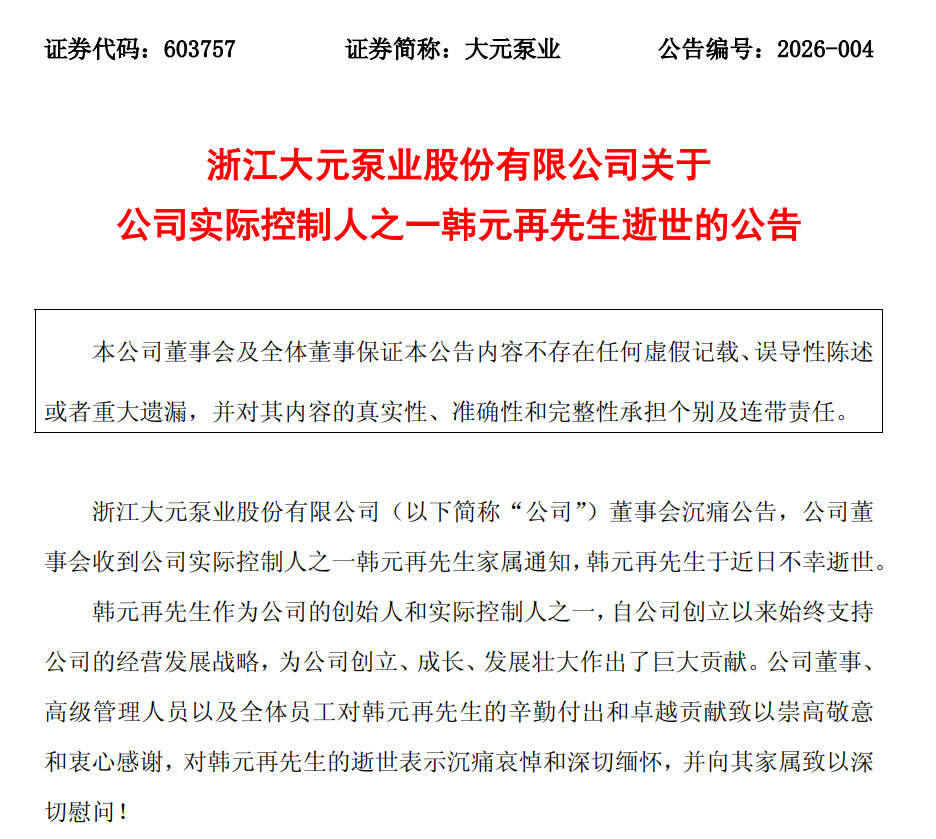 每经记者|蔡鼎 每经编辑|何小桃 文多 大元泵业(SH603757,股价44.73元,市值83.44亿元)2月25日盘后公告称,公司实控人之一韩元再于近日不幸逝世。 据公告,韩元再持有公司2108.96万股股份,占公司总股本的11.31%(持股市值约9.49亿元)。韩元再逝世后,其所持有的公司股份后续将按照相关法律 法规进行处置,相关手续办理完成后预计将导致公司实际控制人的构成发生变化,公司将根据事项进展情况及时履行信息披露义务。 目前,公司生产经营活动正常。公司董事、高级管理人员及全体员工将继续勤勉尽责,致力于公司的持续稳健发展。 图片来源:大元泵业公告 公司核心元老之一 大元泵业介绍,韩元再作为公司的创始人和实控人之一,自公司创立以来始终支持公司的经营发展战略,为公司创立、成长、发展壮大作出了巨大贡献。 "公司董事、高级管理人员以及全体员工对韩元再先生的辛勤付出和卓越贡献致以崇高敬意和衷心感谢,对韩元再先生的逝世表示沉痛哀悼和深切缅怀, 并向其家属致以深切慰问!"大元泵业在公告中称。 公开资料显示,韩元再出生于1955年6月,汉族,小学学历,是大元泵业最核心的元老和出资人之一。1993年6月,公司前身温岭 ...