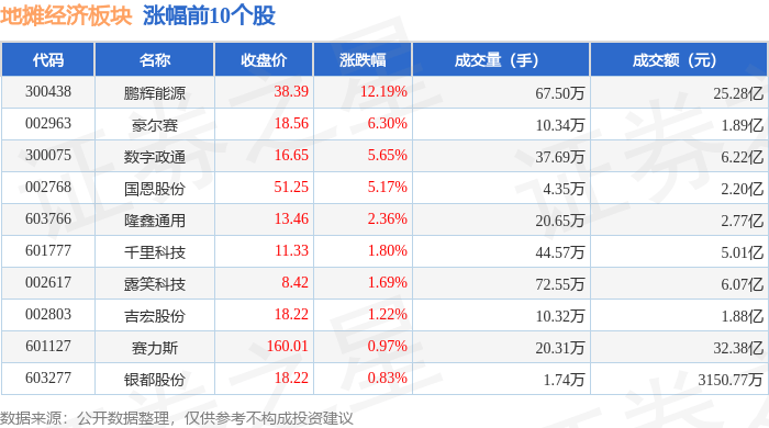 证券之星消息,10月24日地摊经济板块较上一交易日上涨0.55%,鹏辉能源领涨。当日上证指数报收于 3950.31,上涨0.71%。深证成指报收于13289.18,上涨2.02%。地摊经济板块个股涨跌见下表: | 代码 | 名称 | 收盘价 | 涨跌幅 | 成交量(手) | 成交额(元) | | --- | --- | --- | --- | --- | --- | | 300438 | 鹏辉能源 | 38.39 | 12.19% | 67.50万 | 25.28亿 | | 002963 | 豪尔赛 | 18.56 | 6.30% | 10.34万 | 1.89亿 | | 300075 | 数字政通 | 16.65 | 5.65% | 37.69万 | 6.22亿 | | 002768 | 国恩股份 | 51.25 | 5.17% | 4.35万 | 2.20亿 | | 603766 | 隆幸通用 | 13.46 | 2.36% | 20.65万 | 2.77亿 | | 601777 | 千里科技 | 11.33 | 1.80% | 44.57万 | 5.01亿 | | 002617 | 露実科技 | 8.4 ...
