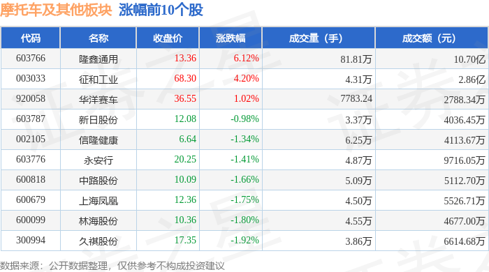 | 代码 | 名称 | 收盘价 | 涨跌幅 | 成交量(手) | 成交额(元) | | | --- | --- | --- | --- | --- | --- | --- | | 600818 | 中路股份 | 10.26 | -2.10% | 7.50万 | | 7749.87万 | | 301322 | 绿通科技 | 33.90 | -1.82% | 2.83万 | | 9699.67万 | | 834058 | 华洋赛车 | 36.51 | -1.80% | 1 8130.15 | | 3000.05万 | | 603787 | 新日股份 | 12.10 | -1.06% | 2.05万 | | 2498.24万 | | 301345 | 涛涛车业 | 210.00 | -1.03% | 9077.24 | | 1.90亿 | | 603766 | 障 | 12.02 | -0.91% | 15.41万 | | 1.86亿 | | 6600009 | 林海股份 | 10.56 | -0.66% | 2.59万 | | 2741.67万 | | 601777 | 千里科技 | 12.43 | 0.08% ...