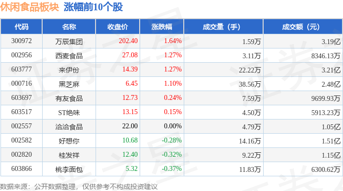 证券之星消息,12月26日休闲食品板块较上一交易日上涨0.02%,万辰集团领涨。当日上证指数报收于 3963.68,上涨0.1%。深证成指报收于13603.89,上涨0.54%。休闲食品板块个股涨跌见下表: | 代码 | 名称 | 收盘价 | 涨跌幅 | 成交量(手) | 成交额(元) | | --- | --- | --- | --- | --- | --- | | 300972 | 万辰集团 | 202.40 | 1.64% | 1.59万 | 3.19 Z | | 002956 | 西麦食品 | 27.08 | 1.27% | 3.11万 | 8346.13万 | | 603777 | 来伊份 | 14.39 | 1.27% | 22.22万 | 3.21亿 | | 000716 | 性和服 | 6.45 | 1.10% | 38.56万 | 2.48亿 | | 603697 | 有友食品 | 12.73 | 0.24% | 7.59万 | 9699.93万 | | 603517 | ST绝味 | 13.15 | 0.15% | 4.50万 | 5913.23万 | | 002557 | 治治食品 | ...