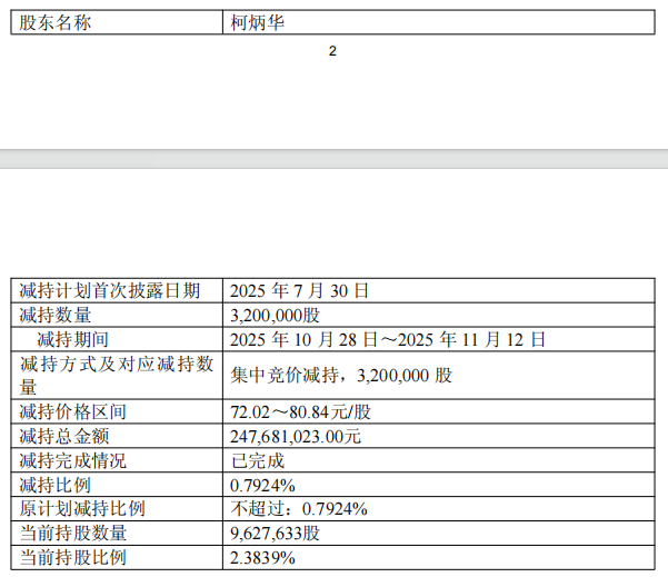 (编辑 姚尧) 证券日报网讯 11月12日晚间,科博达发布公告称,本次减持计划实施前,科博达技术股份有限公司 (以下简称"公司")实际控制人之一柯炳华先生直接持有公司无限售流通股12,827,633股,占公司总 股本的3.1763%。近日,公司收到柯炳华先生发来的《告知函》。截至2025年11月12日,柯炳华先生通 过集中竞价交易方式减持股份3,200,000股,占公司总股本比例为0.7924%。本次减持计划已实施完 毕。 ...