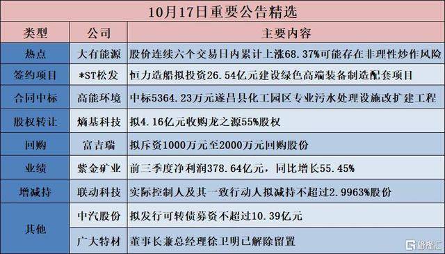 | | | 10月17日重要公告精选 | | --- | --- | --- | | 类型 | 公司 | 主要内容 | | 热点 | 大有能源 | 股价连续六个交易日内累计上涨68.37%可能存在非理性炒作风险 | | 签约项目 | *ST松发 | 恒力造船拟投资26.54亿元建设绿色高端装备制造配套项目 | | 合同中标 | 高能环境 | 中标5364.23万元遂昌县化工园区专业污水处理设施改扩建工程 | | 股权转让 | 嫡基科技 | 拟4.16亿元收购龙之源55%股权 | | 回购 | 富吉瑞 | 拟斥资1000万元至2000万元回购股份 | | 业绩 | 紫金矿业 | 前三季度净利润378.64亿元,同比增长55.45% | | 增减持 | 联动科技 | 实际控制人及其一致行动人拟减持不超过2.9963%股份 | | 其他 | 中汽股份 | 拟发行可转债券资不超过10.39亿元 | | | 广大特材 | 革事长兼总经理徐卫明已解除留置 图书语 | 高能环境(603588.SH):中标5364.23万元遂昌县化工园区专业污水处理设施改扩建工程一期 【股权收购】 熵基科技(301330.SZ):拟4.16 ...