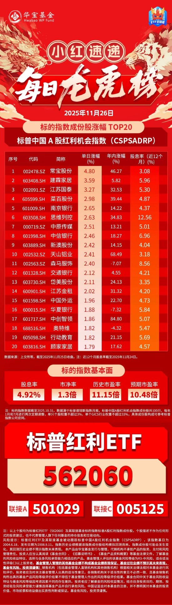 炒股就看金麒麟分析师研报,权威,专业,及时,全面,助您挖掘潜力主题机会! 责任编辑:宋雅芳 | 18 | 688516.SH | 奥特维 | 1.82 | -4.32 | 5.47 | | --- | --- | --- | --- | --- | --- | | 19 | 605098.SH | 行动教育 | 1.82 | 21.15 | 5.69 | | 20 | 603816.SH | 顾家家居 | 1.79 | 17.62 | 4.57 | | | | 数据来源:上交所等,截至2025年11月25日收盘。注:近12个月股息率截至2025年11月24日。 | | | | | | | | 标的指数基本面 | | | | | 股息率 | 市净率 | 历史市盈率 | | 预期市盈率 | | | 4.92% | 1.3倍 | 11.15倍 | | 10.48倍 | ...