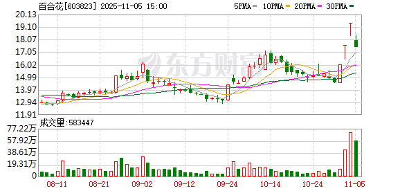 百合花集团股份有限公司 证券代码:603823 证券简称:百合花 公告编号:2025-043 股票交易风险提示公告 本公司董事会及全体董事保证本公告内容不存在任何虚假记载、误导性陈 述或者重大遗漏,并对其内容的真实性、准确性和完整性承担个别及连带责任。 重要内容提示: ●公司股票于 2025 年 10 月 30 日、10 月 31 日及 11 月 3 日连续三个交易日 内日收盘价格涨幅偏离值累计超过 20%,根据《上海证券交易所交易规则》的有 关规定,属于股票交易异常波动。2025 年 11 月 4 日公司股价再次涨停。敬请广 大投资者注意二级市场交易风险,理性决策,审慎投资。 ●公司 2025 年第三季度实现营业收入 512,449,095.81 元,比上年同期减少 10.19%;实现归属于上市公司股东的净利润 35,896,184.45 元,比上年同期减少 17.72%。敬请广大投资者注意公司经营风险。 ●截止 2025 年 11 月 4 日收盘,公司股价连续 30 个交易日内的累计涨幅为 41.43%,远高于行业指数相关指标。公司股价短期涨幅较大,可能存在炒作风险, 敬请投资者注意二级市场交易风险。 ● ...