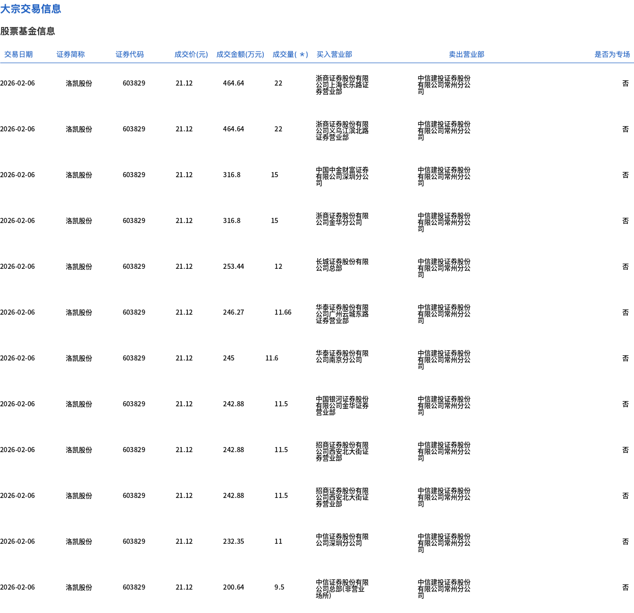 | 交易日期 | 证券简称 | 证券代码 | 成交价(元) | | 成交金额(万元) 成交量(*) 买入营业部 | | 卖出营业部 | | --- | --- | --- | --- | --- | --- | --- | --- | | 2026-02-06 | 洛凯股份 | 603829 | 21.12 | 464.64 | 22 | | | | 2026-02-06 | 洛凯股份 | 603829 | 21.12 | 464.64 | 22 | | 看限公司营州分公 | | 2026-02-06 | 洛凯股份 | 603829 | 21.12 | 316.8 | 12 | 者處公言受見分為 | 早隨公司常州宁 | | 2026-02-06 | 洛凯股份 | 603829 | 21.12 | 316.8 | 12 | 公司非空反公司限 | | | 2026-02-06 | 洛凯股份 | 603829 | 21.12 | 253.44 | 12 | 长城址劳股份有限 | | | 2026-02-06 | 洛凯股份 | 603829 | 21.12 | 246.27 | 11.66 | 參班夯版位皇陵 | 于 ...