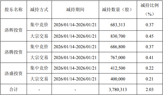 中国经济网北京1月23日讯洛凯股份(603829)(603829.SH)昨日晚间发布关于第一大股东及其一致行动 人权益变动触及5%刻度的提示性公告。 2026年1月14日至2026年1月21日,洛凯股份的加权均价为25.957元。经计算,上述股东减持金额约为 9812.56万元。 | 股东名称 | 减持方式 | 减持期间 | 减持数量(股) | 減持比例 | | --- | --- | --- | --- | --- | | | | | | (%) | | 洛辉投资 | 集中竞价 | 2026/01/14-2026/01/21 | 683,313 | 0.37 | | | 大宗交易 | 2026/01/14-2026/01/21 | 830,700 | 0.45 | | 洛腾投资 | 集中竞价 | 2026/01/14-2026/01/21 | 686,800 | 0.37 | | | 大宗交易 | 2026/01/14-2026/01/21 | 767,000 | 0.41 | | 洛盛投资 | 集中竞价 | 2026/01/14-2026/01/21 | 412,500 | 0.22 | | | 大宗交易 ...