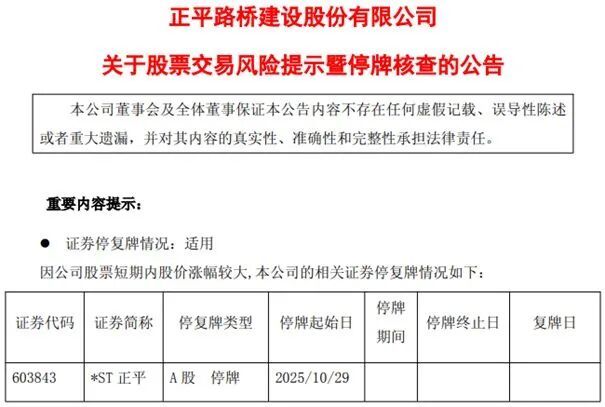 | 证券代码 | 证券简称 | 停复牌类型 | 停牌起始日 | 停牌 期间 | 停牌终止日 | 复牌日 | | --- | --- | --- | --- | --- | --- | --- | | 603843 | *ST 正平 | A 股 停牌 | 2025/10/29 | | | | 图片来源:*ST正平公告 "29天21板"牛股*ST正平(SH603843,股价6.79元,市值48亿元)10月28日晚间公告称,公司股票自2025年9月1日至10月28日累计涨幅为152.42%,期间 21天涨停,5次触及股票交易异常波动。股价上涨过快,为维护投资者利益,公司将自10月29日起停牌核查,预计停牌时间不超过10个交易日。 公告称,公司股票价格已严重脱离当前基本面。"目前,公司基本面未发生重大变化,但近期公司股票交易价格已严重脱离公司目前的基本面情况,投资 者参与交易可能面临较大的市场风险。" 一个月内的第二次停牌核查 《每日经济新闻》记者(以下简称每经记者)注意到,这并不是*ST正平近期首次停牌核查,公司10月9日起便停牌了5个交易日,且公司已对前期股票交 易异常波动情况进行了停牌核查,于2025年10月1 ...