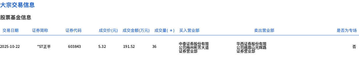 10月22日,*ST正平大宗交易成交36万股,成交额191.52万元,占当日总成交额的3.83%,成交价5.32元,较市场收盘价5.59元折价4.83%。 | 交易日期 | 证券简称 | 证券代码 | 成交价(元) 成交金额(万元) 成交量( * ) 买入营业部 | | | | | 卖出营业部 | | --- | --- | --- | --- | --- | --- | --- | --- | --- | | 2025-10-22 | *STTF平 | 603843 | 5.32 | 191.52 | 36 | 中泰证券股份有限 公司梅州彬筹夫遭 | 华西证券股份有限 公司峨眉山光辉露 | | ...
