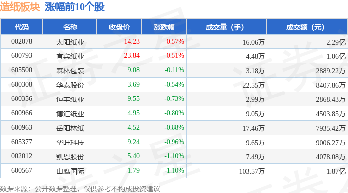 | 代码 | 名称 | 收盘价 | 涨跌幅 | 成交量(手) | 成交额(元) | | --- | --- | --- | --- | --- | --- | | 605377 | 华旺科技 | 9.20 | -0.22% | 7.66万 | 7072.29万 | | 600356 | 恒丰纸业 | 9.74 | 0.10% | 3.73万 | 3617.97万 | | 603863 | 松炀资源 | 18.61 | 0.11% | 9.25万 | 1.71亿 | | 002078 | 太阳纸业 | 14.39 | 0.14% | ﻛ 8.87万 | 1.28亿 | | 600308 | 华泰股份 | 3.73 | 0.27% | 13.61万 | 5074.52万 | | 600433 | 冠蒙高新 | 3.39 | 0.30% | 19.12万 | 6454.91万 | | 603165 | 荣晟环保 | 13.13 | 0.31% | 2.87万 | 3747.86万 | | 000488 | ST晨鸣 | 2.08 | 0.48% | 12.88万 | 2679.94万 | | 002521 | 齐峰 ...