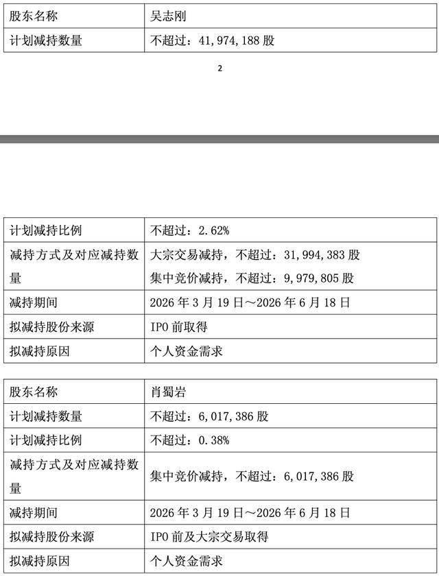 2月25日,桃李面包(603866)发布公告,自本公告披露日起15个交易日后的3个月内,公司控股股东及 实际控制人吴志刚计划通过大宗交易的方式减持股份数量合计不超过31,994,383股,占公司股份总数的 2%。计划通过集中竞价交易的方式减持股份数量合计不超过9,979,805股,占公司股份总数的0.62%。 视为一致行动人的肖蜀岩计划通过集中竞价交易的方式减持股份数量合计不超过6,017,386股,占公司股 份总数的0.38%。 截至本公告披露日,公司控股股东及实际控制人吴志刚持有公司股份87,539,682股,约占公司总股本的 5.47%;视为一致行动人肖蜀岩持有公司股份6,017,386股,约占公司总股本的0.38%。这也意味着,肖 蜀岩此次计划为"清仓式"减持。 | 股东名称 | 吴志刚 | | --- | --- | | 计划减持数量 | 不超过:41,974,188 股 | | 计划减持比例 | 不超过:2.62% | | --- | --- | | 减持方式及对应减持数 | 大宗交易减持,不超过:31,994,383 股 | | 量 | 集中竞价减持,不超过:9,979,805 股 | | 减持 ...