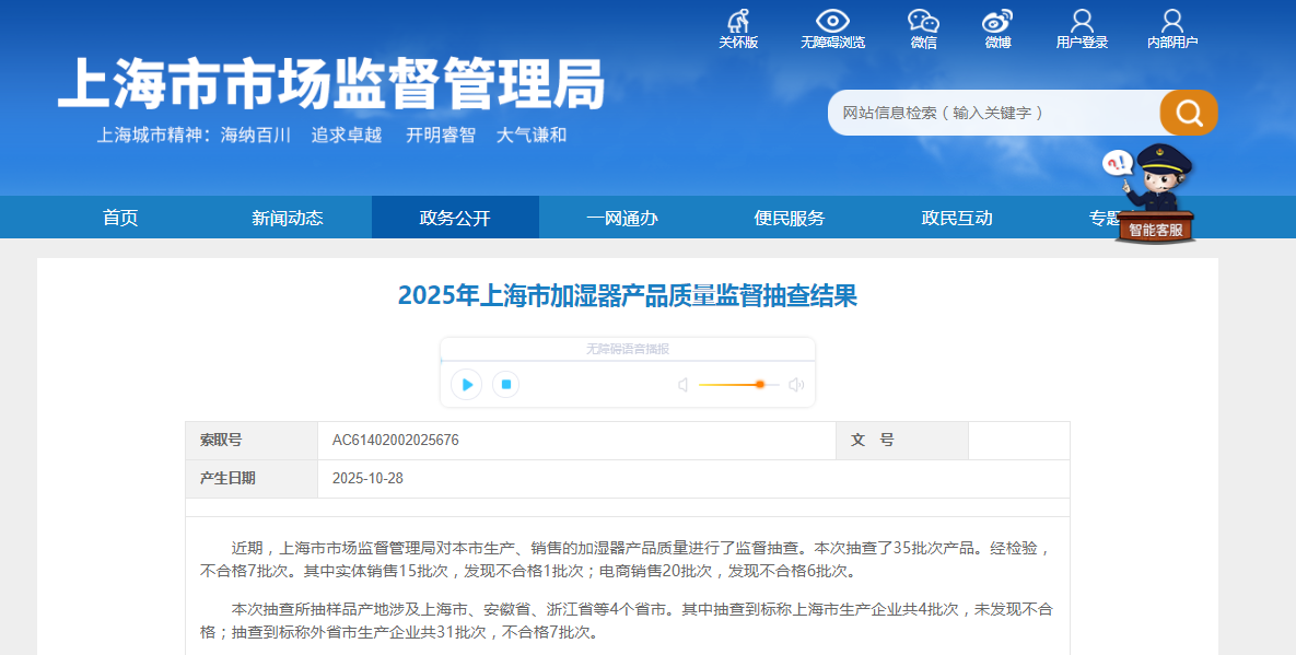 2025年上海市加湿器产品质量监督抽查结果公布