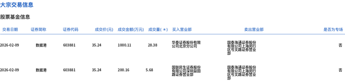2月9日,数据港大宗交易成交34.06万股,成交额1200.27万元,占当日总成交额的0.21%,成交价35.24 元,较市场收盘价39.55元折价10.9%。 | 交易日期 | 证券調核 | 证券代码 | 成交价(元) | 成交金额(万元) 成交量(*) 买入营业部 | | | 类出管业部 | 是否为专场 | | --- | --- | --- | --- | --- | --- | --- | --- | --- | | 2026-02-09 | 数据港 | 603881 | 35.24 | 1000.11 28.38 | 公司北京分公司限 | 200 | | 客 | | 2026-02-09 | 数据准 | 603881 | 35.24 | 200.16 5.68 | 要有零售量品 | 量量 | | Ka | ...