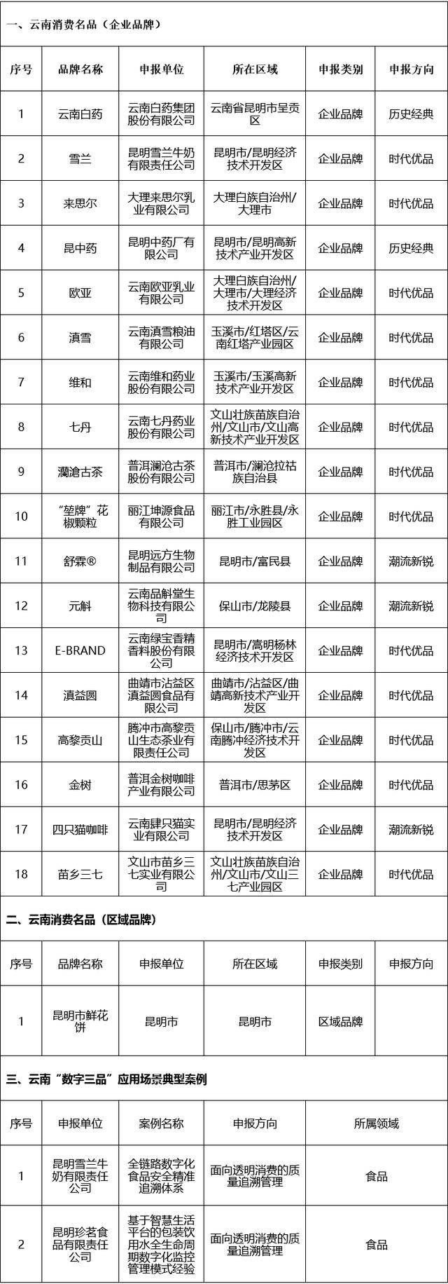 珠江网2025-11-06 15:35:34 附件:第二批云南消费名品方阵名录 云南省工业和信息化厅关于 第二批云南消费名品方阵名录的公示 根据《云南省工业和信息化厅关于开展2025年云南消费名品方阵申报工作的通知》(〔2025〕119 号),在企业申报和州市推荐基础上,经资料初审、综合审查、部门审核等工作程序,现将第二批云南 消费名品方阵名录予以公示,接受社会监督。 公示时间自2025年11月6日起至2025年11月12日止,共5个工作日。如有异议,请于公示期内向云南省工 业和信息化厅反映。 联系电话:厅直属机关纪委 0871-63512537 消费品工业处 0871-63513569 11月5日 云南省工业和信息化厅 发布关于第二批 云南消费名品方阵名录的公示 都有哪些品牌入选? 跟小布一起看 ↓↓ 云南省工业和信息化厅 2025年11月5日 资料:云南省工业和信息化厅 第二批云南消费名品方阵名录 来源:云南发布 | 序号 | 品牌名称 | 申报单位 | 所在区域 | 申报类别 | 申报方向 | | --- | --- | --- | --- | --- | --- | | 1 | 云南自药 | 云南白药 ...