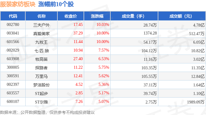 证券之星消息,11月13日服装家纺板块较上一交易日上涨1.3%,三夫户外领涨。当日上证指数报收于 4029.5,上涨0.73%。深证成指报收于13476.52,上涨1.78%。服装家纺板块个股涨跌见下表: | 代码 | 名称 | 收盘价 | 涨跌幅 | 成交量(手) | 成交额(元) | | | --- | --- | --- | --- | --- | --- | --- | | 002780 | 三夫户外 | 17.45 | 10.03% | 28.74万 | | 4.78亿 | | 003041 | 直要美家 | 37.29 | 10.00% | 1374.28 | | 512.47万 | | 601566 | 九牧王 | 11.44 | 10.00% | 54.17万 | | 6.05亿 | | 002029 | 七匹狼 | 10.94 | 7.57% | 104.12万 | | 10.82亿 | | 603908 | 牧高笛 | 27.40 | 6.53% | 11.16万 | | 3.02亿 | | 300005 | 探路者 | 11.22 | 5.75% | 103.35万 | | 11.35 ...