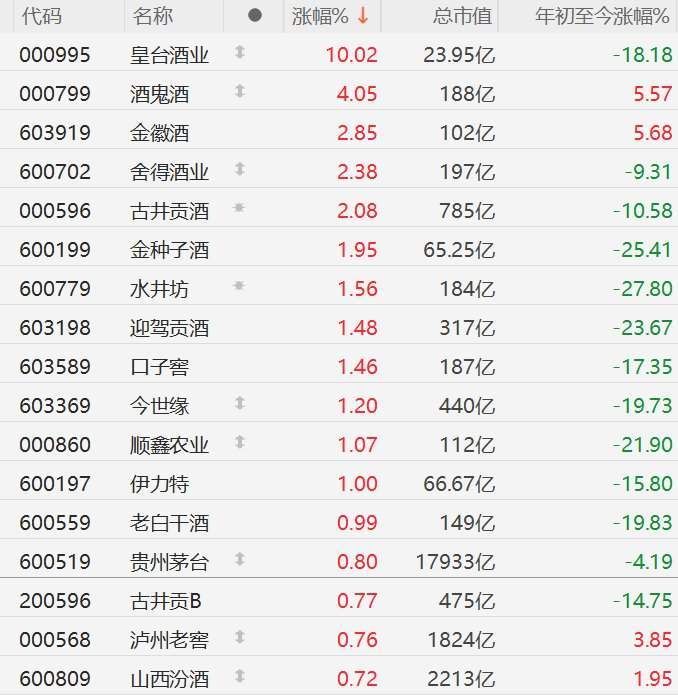 消息面上,茅台新控量政策消息传开后,市场价格立即予以反应。酒商反馈称,昨天天津飞天茅台拿货 已经涨到1630元/瓶,两日涨幅超过150元/瓶。第三方平台"今日酒价"数据显示,12月14日,25年飞天茅 台(原箱)较前一日大涨70元,报1590元/瓶;25年飞天茅台(散瓶)较前一日也大涨70元,报1570元/瓶。但 天津和江苏酒商称,控量消息传开后,由于周末茅台经销商休息,黄牛开始坐地抬价,一天价格多次调 整,甚至改成时价拿货。 | 代码 | 名称 | | 涨幅% ↓ | 总市值 | 年初至今涨幅% | | --- | --- | --- | --- | --- | --- | | 566000 | 皇台酒业 | 1 | 10.02 | 23.95亿 | -18.18 | | 000799 | 酒鬼酒 | 1 | 4.05 | 188亿 | 5.57 | | 603919 | 金徽酒 | | 2.85 | 102亿 | 5.68 | | 600702 | 毛得酒业 | 1 | 2.38 | 197亿 | -9.31 | | 000596 | 古井贡酒 | 豪 | 2.08 | 785亿 | -10.58 | | ...