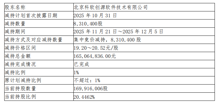 南财智讯12月5日电,中科软公告,公司股东北京科软创源软件技术有限公司在2025年11月21日至12月5 日期间,通过集中竞价交易方式合计减持公司股份831.04万股,占公司总股本的1.00%。本次减持计划 已实施完毕,减持后北京科软创源软件技术有限公司持有公司股份169,916,006股,占公司总股本的 20.4462%。减持价格区间为19.20元至20.52元/股,减持总金额为1.65亿元。本次减持行为遵守相关法律 法规,与此前披露的减持计划一致。 ...