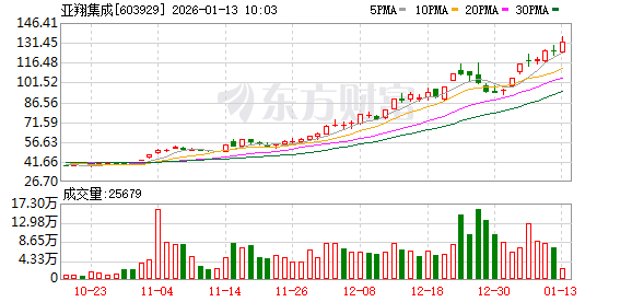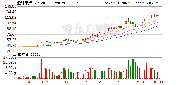 亚翔集成股价再创历史新高,该股近期呈不断突破新高之势,近一个月累计有12个交易日股价刷新历史 纪录。截至09:40,该股目前上涨8.08%,股价报136.36元,成交131.59万股,成交金额1.73亿元,换手 率0.62%,该股最新A股总市值达290.94亿元,该股A股流通市值290.94亿元。 证券时报·数据宝统计显示,亚翔集成所属的建筑装饰行业,目前整体涨幅为0.37%,行业内,目前股价 上涨的有99只,涨幅居前的有亚翔集成、农尚环境、勘设股份等,涨幅分别为8.08%、8.02%、6.38%。 股价下跌的有49只,跌幅居前的有上海港湾、杭萧钢构、东南网架等,跌幅分别为8.42%、7.57%、 5.51%。 机构评级来看,近10日共有1家机构对该股进行评级,1月13日国泰海通证券发布的研报给予公司目标价 为162.80元。 公司1月12日在交易所互动平台披露,截至最新(1月10日)股东户数为19134户,较上期(12月31日) 减少5871户,环比下降23.48%。 公司发布的三季报数据显示,前三季度公司共实现营业收入31.09亿元,同比下降29.63%,实现净利润 4.42亿元,同比增长0.78%,基本 ...