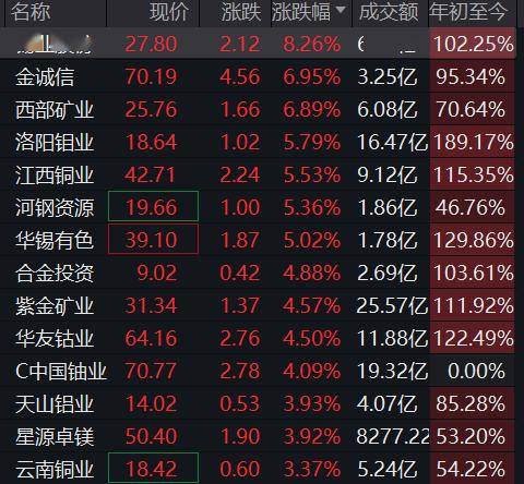 A股有色金属股普涨,锡业股份、西部矿业涨超3%